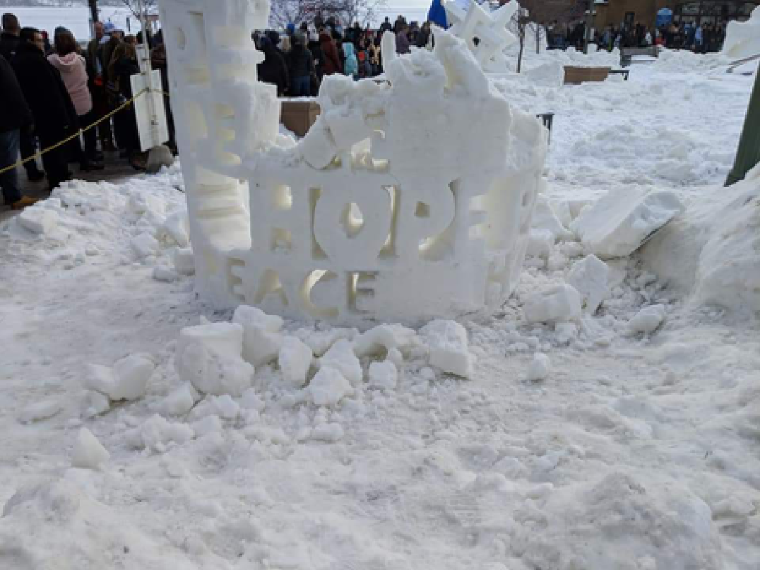 She was so grateful for her time at Aims as it gave her the courage to try many new things. During this time, she learned how to do snow sculpting and went on to compete in national competitions. Snow sculpting is a bit like sand sculpting – only much colder. The snow is produced with a snow machine and teams work together using a variety of tools within a time frame to complete their project. She will never forget the experience of competing at the national level. The competition took place at Lake Geneva where everything around her was frozen. At -28 degrees Fahrenheit, this was some of the coldest weather she had ever experienced – so cold that they weren’t even able to start sculpting the first day. When they finally were able to begin, Carrie’s eyelashes froze within minutes. Despite the frigid temperatures, her team pressed on to bring the design from their imaginations into reality. They had four days to complete their masterpiece and worked hard to uncover the fine details and intricately carve out the words “Peace, Hope and Love.” After several hours of applying intense focus, heart, skill, and passion; the design was finished. It was a beautiful piece! The words “Peace, Hope and Love” had spun all around the piece and spiraled into the heavens.